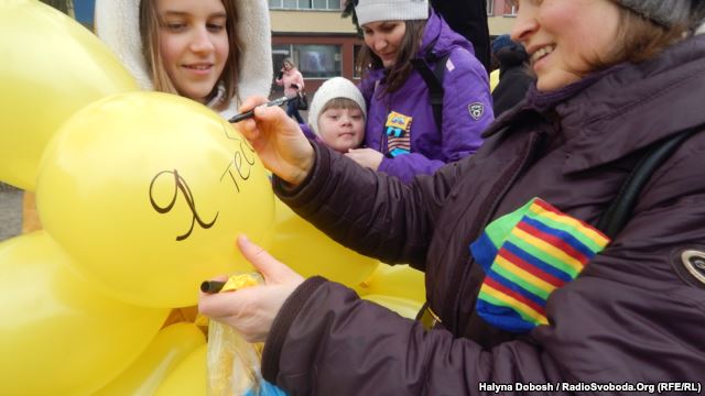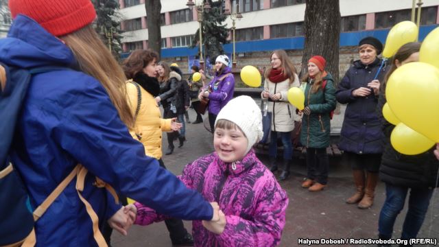 Батьки з такими дітьми та волонтери дарували перехожим жовті повітряні кульки, разом співали і танцювали. У багатьох були розпізнавальні знаки – кольорові шкарпетки, інформує Радіо Свобода.