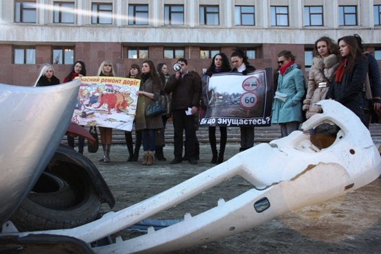 В Івано-Франківську молодь протестувала проти поганого стану доріг. Сьогодні в обласному центрі Прикарпаття молодь провела акцію "Досить латати дорогу ланяками".