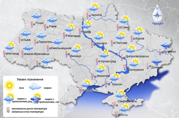Невеликий дощ, в західній частині з мокрим снігом, у східних областях та Приазов'ї дощі, лише вночі у південних та центральних областях без опадів, повідомляють в УкрГМЦ.