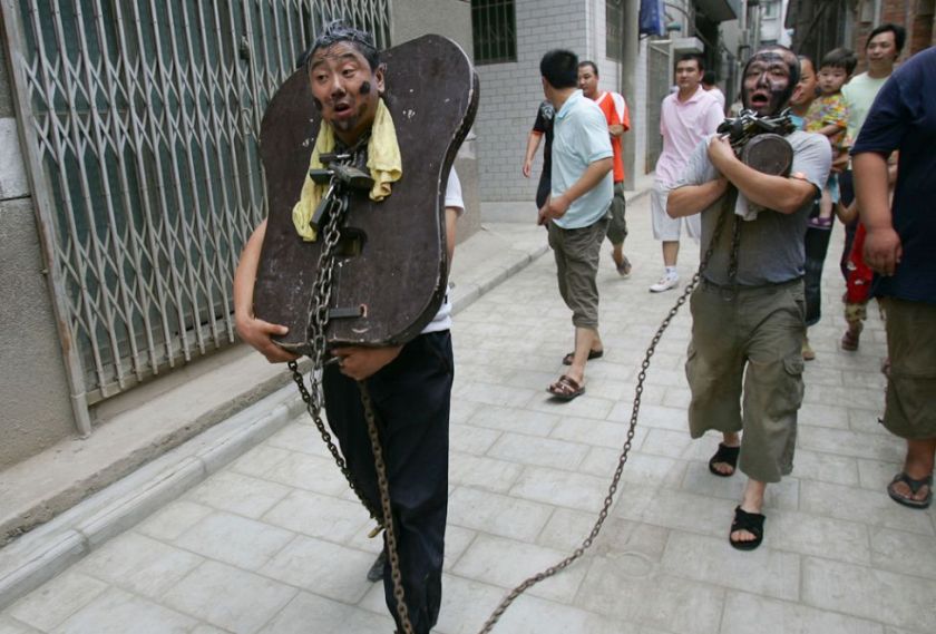 Наречений (ліворуч) та його свідок йдуть з брудним обличчям і з кайданами на шиях за нареченою під час церемонії одруження в китайській провінції Шааньсі. Під час церемонії друзі і родичі нареченого мажуть його і його свідка кремом для взуття і надягають на шию замок, як би кажучи, що наречений міцно і назавжди зв'язаний узами шлюбу.