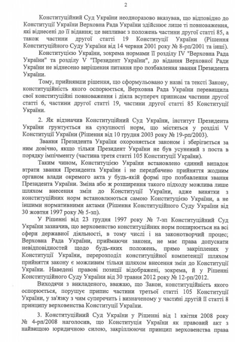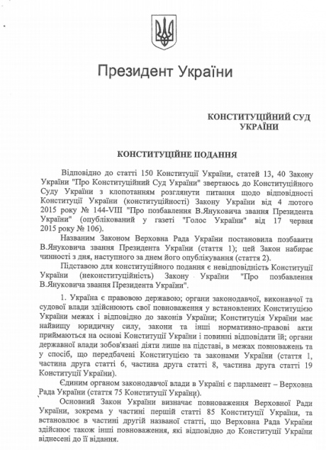 З тексту конституційного подання, розміщеного на сайті Конституційного суду, випливає, що президент Порошенко просить визнати підписаний ним закон, який набув чинності з четверга, неконституційним.