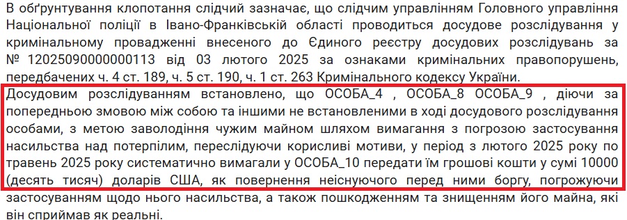 Один із випадків стосується групи з 12 осіб, яка діяла з лютого 2024 року по серпень 2025 року. Учасники вимагали гроші в підприємців і військових, вигадуючи борги, яких не існувало. Вони обирали жертви з урахуванням її фінансового становища та погрожували насильством або пошкодженням майна.