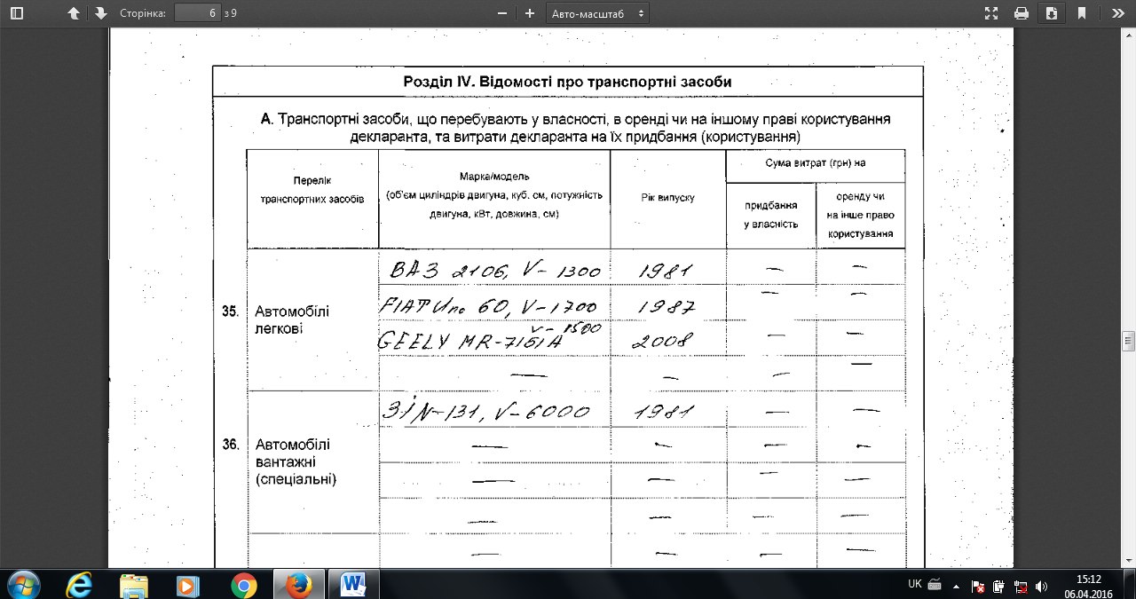 Крім того чоловік володіє трьома легковими автомобілями 1981, 1987 та 2008 років випуску, а також вантажівкою ЗІЛом 1981 року випуску. Також у власності декларанта є два гаражі площею 51 та 51,8 квадратних метрів.