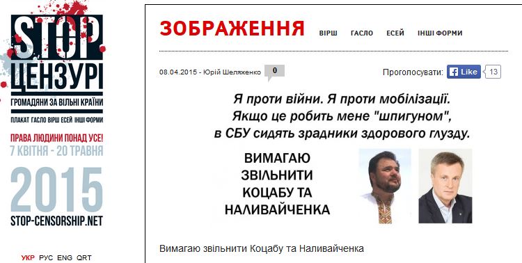 Київський вільний журналіст Юрій Шеляженко взяв участь у міжнародному конкурсі “Стоп цензурі”, згідно умов якого необхідно на сайті конкурсу розмістити тематичний плакат, гасло чи есе.