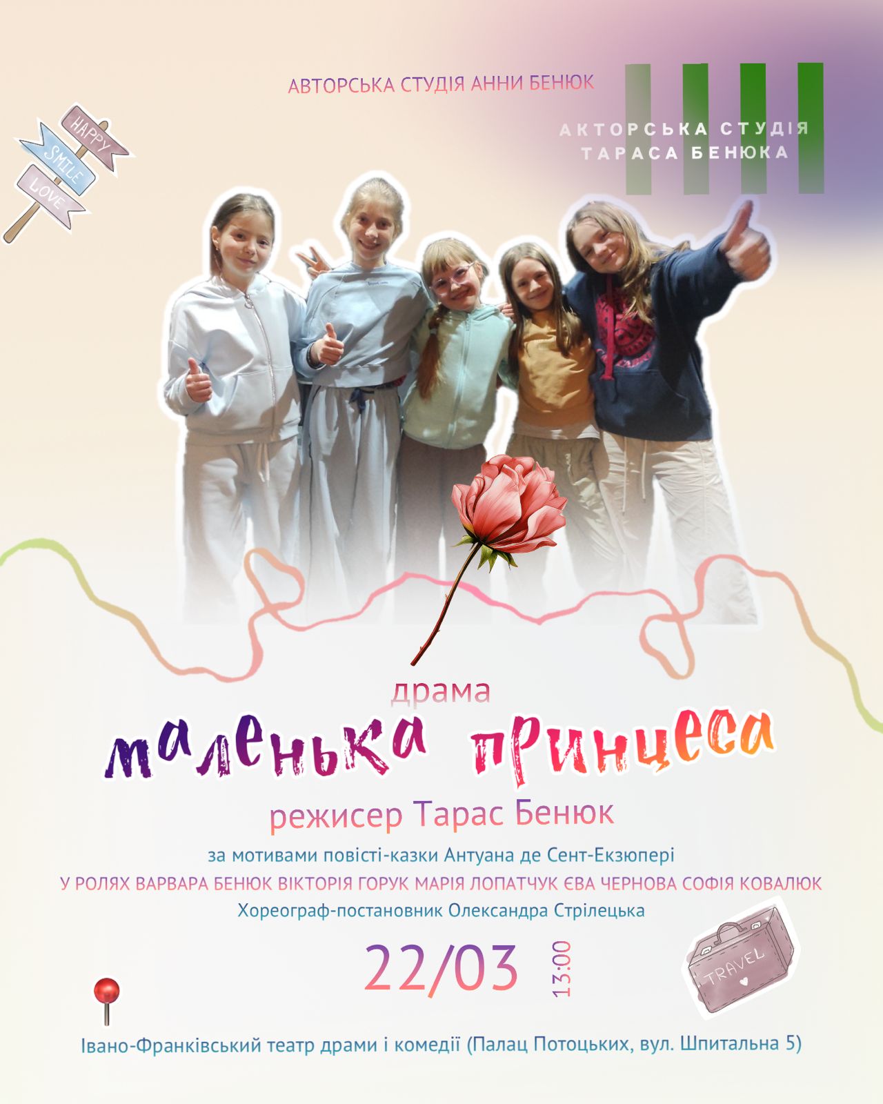 В Івано-Франківську представлять перші визначні творчі результати Акторської студії Тараса Бенюка. Глядачів запрошують на прем’єру вистави «Маленька принцеса», яка створена за мотивами відомої повісті-казки «Маленький принц» Антуана де Сент-Екзюпері.