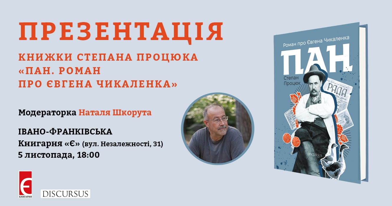 "Запрошуємо вас на презентацію роману "ПАН", щоб наживо поспілкуватися з письменником, автором книжки про Євгена Чикаленка - Степаном Процюком.", — написали організатри.