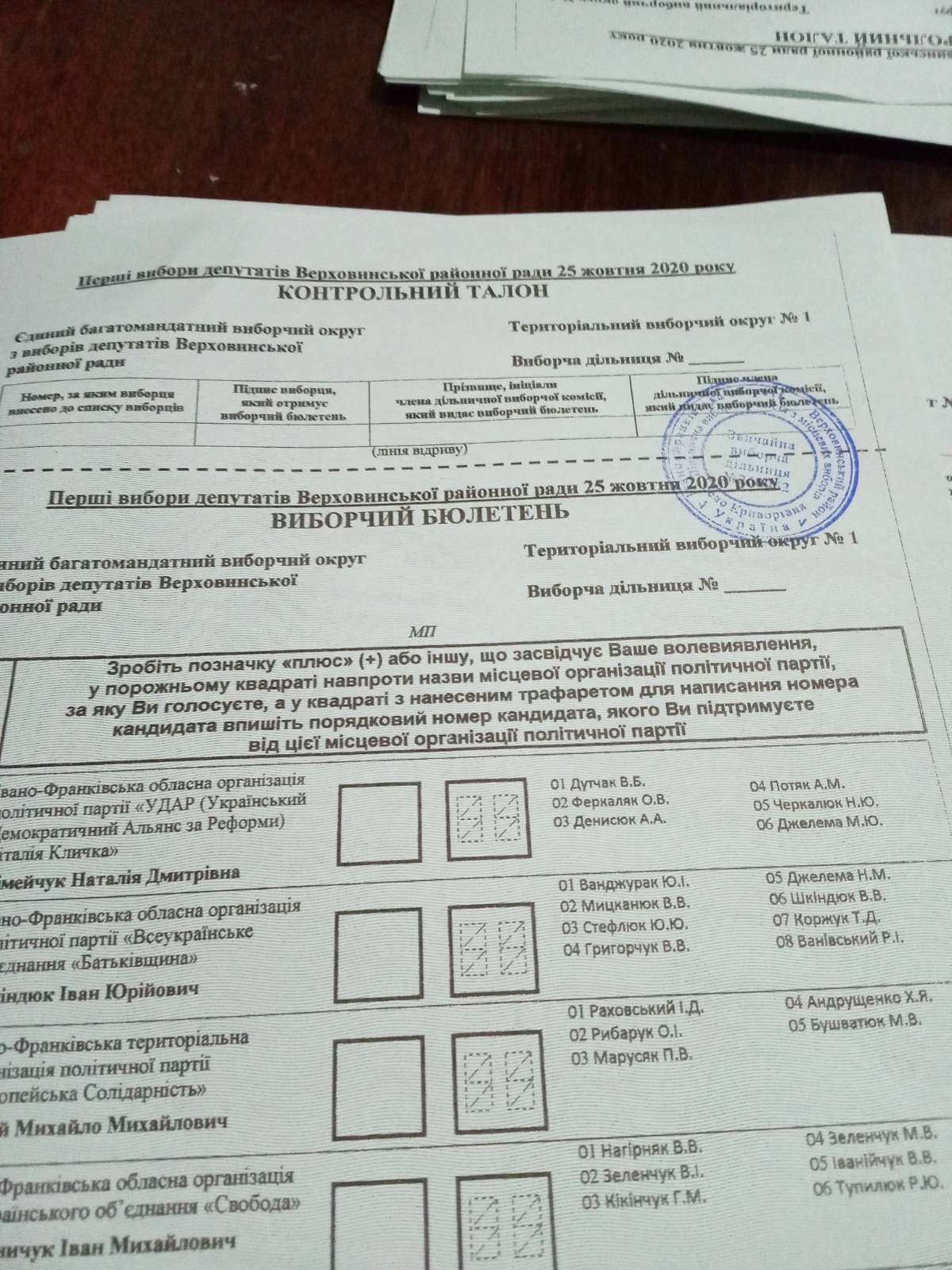 У суботу, 24 жовтня, члени Верховинської селищної ДВК виявили нестачу бюлетенів. А у Криворівні та Краснику бюлетені зіпсували – довелось передруковувати.