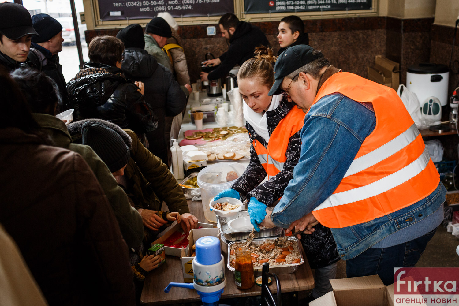 На залізничному вокзалі киян зустрічають волонтери із гарячим чаєм та печивом і випічкою.